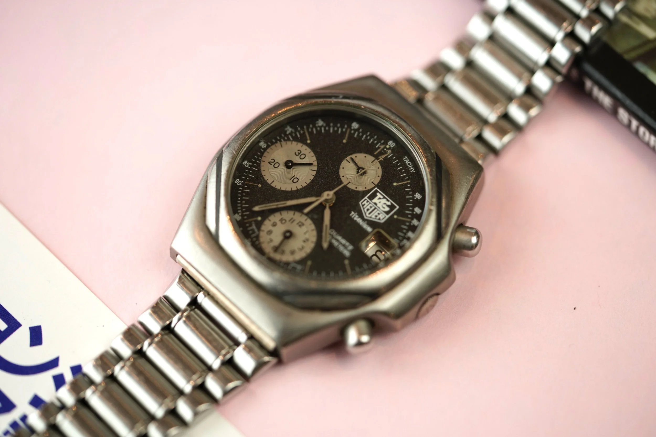 For sale is a bold and lightweight vintage TAG Heuer Titanium Chronograph, reference 223.206, a standout piece from the brand’s 1980s tool-watch era. Crafted in titanium, this chronograph blends rugged functionality with the comfort of a featherweight profile. The watch features a 3-register chronograph layout with white sub dials, a date window at 3 o’clock, and a tachymeter scale for high-speed timing. A true sports watch for land, sea, or track.