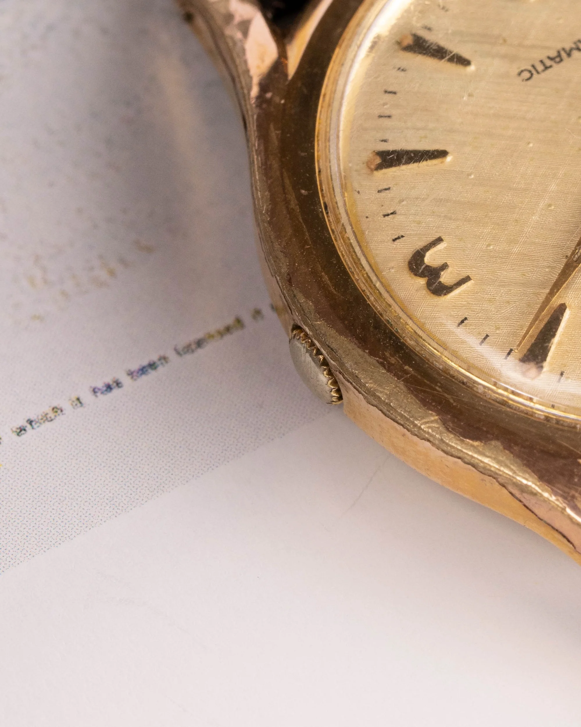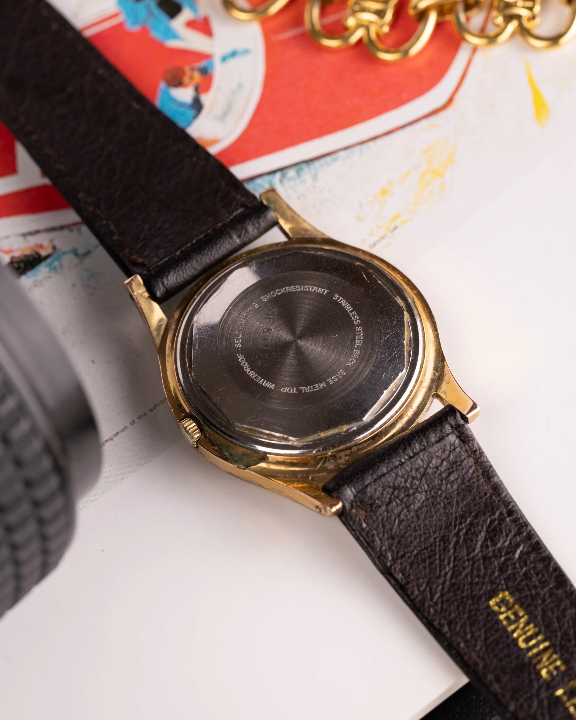 This example features a gold-plated case measuring approximately 34mm, giving it a classic mid-century dress watch presence. The gold dial shows a crosshair linen like texture with applied Arabic numerals at 12, 3, 6, and 9, paired with faceted indices that catch the light beautifully. Slim dauphine hands and a center seconds hand complete the elegant, understated design.
