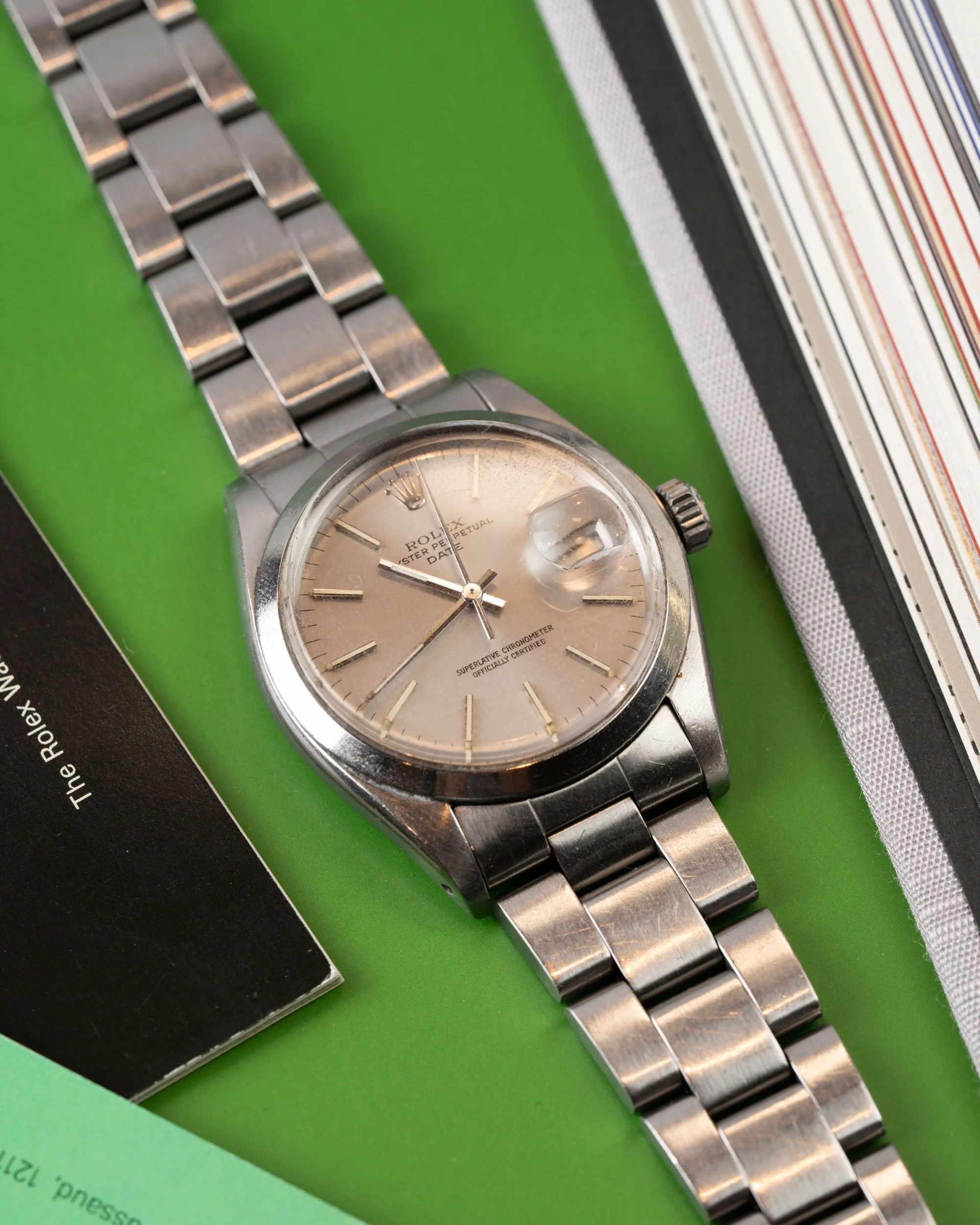This example features a 34mm stainless steel Oyster case, known for its durability and iconic proportions, paired with a silver dial in excellent condition. The applied baton hour markers and classic Rolex stick hands create a clean and legible aesthetic, while the cyclops magnifier at 3 o’clock highlights the practical date function.