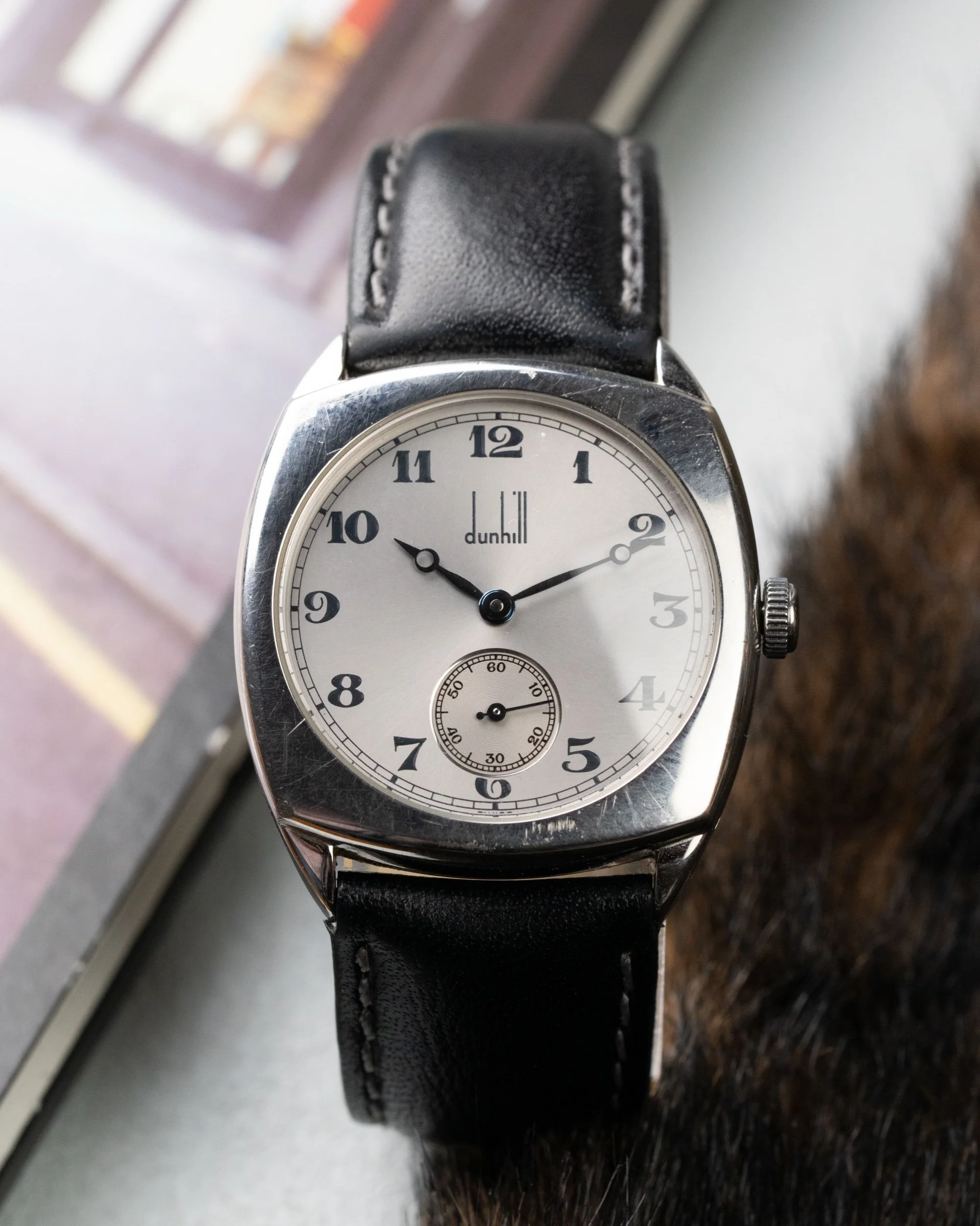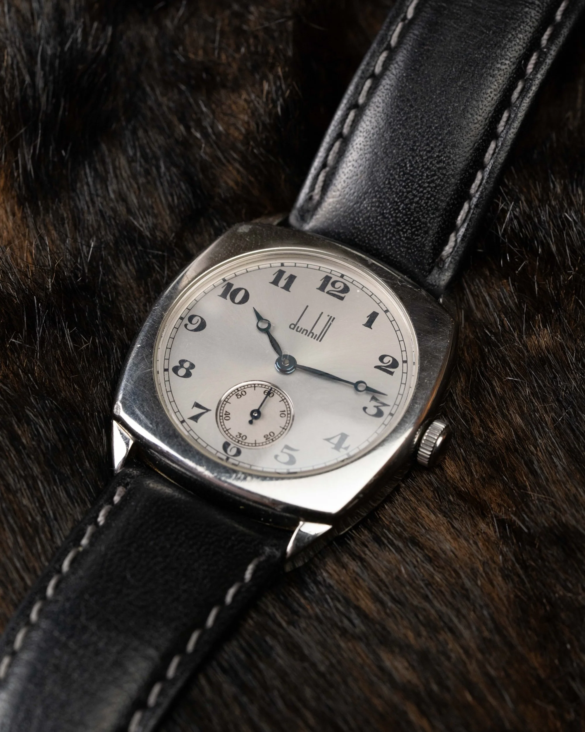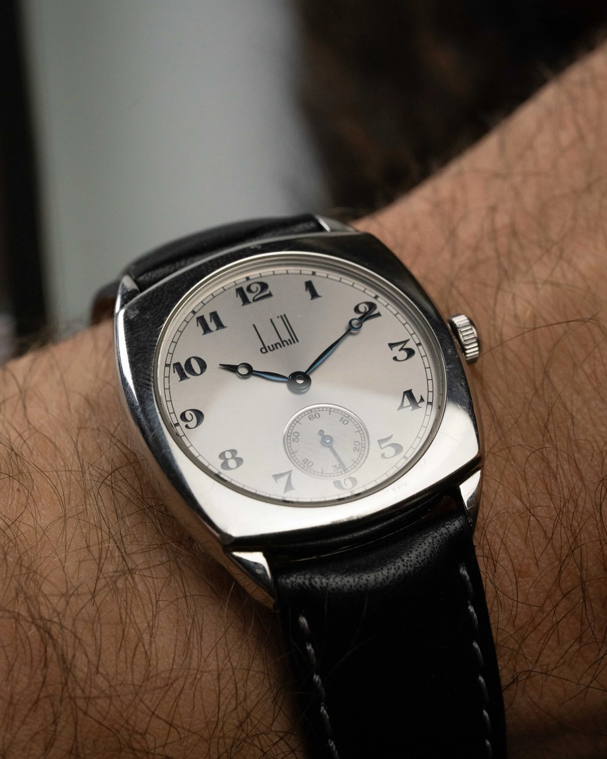 Created to mark Dunhill’s 100th anniversary, this rare timepiece blends early 20th-century charm with refined English design. The cushion-shaped stainless steel case measures a tasteful 32mm, echoing classic wristwatch proportions of the 1920s while offering timeless elegance for modern wear.