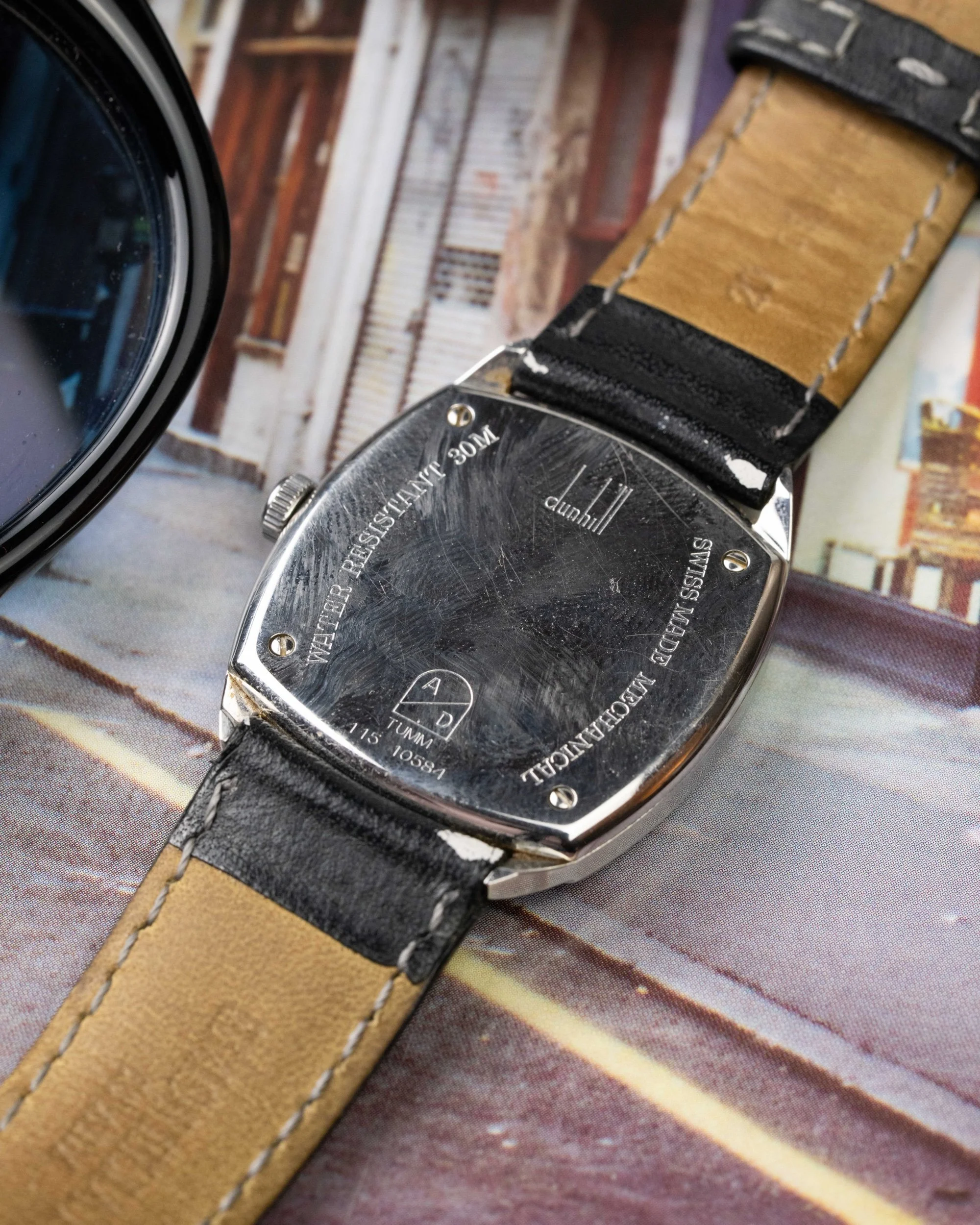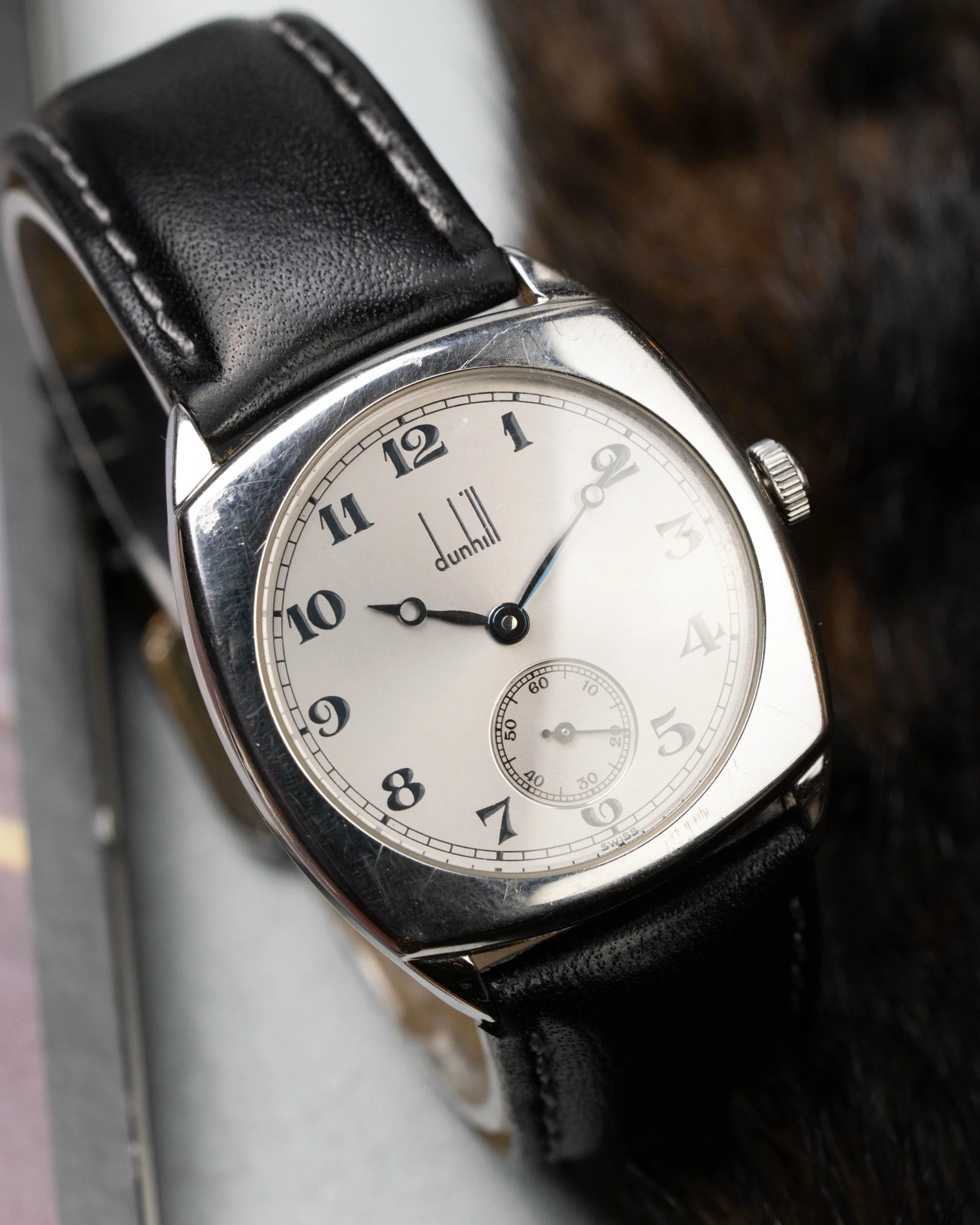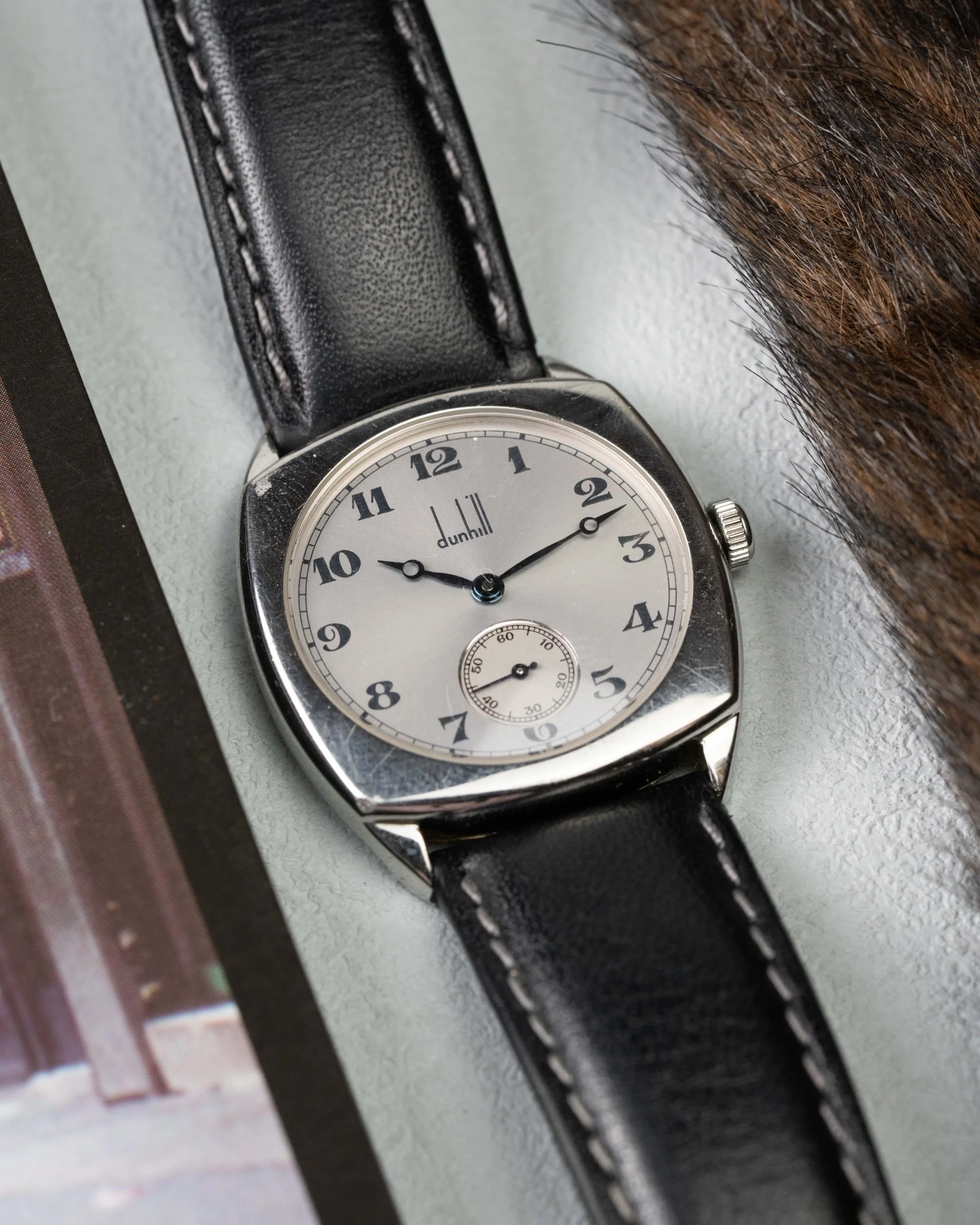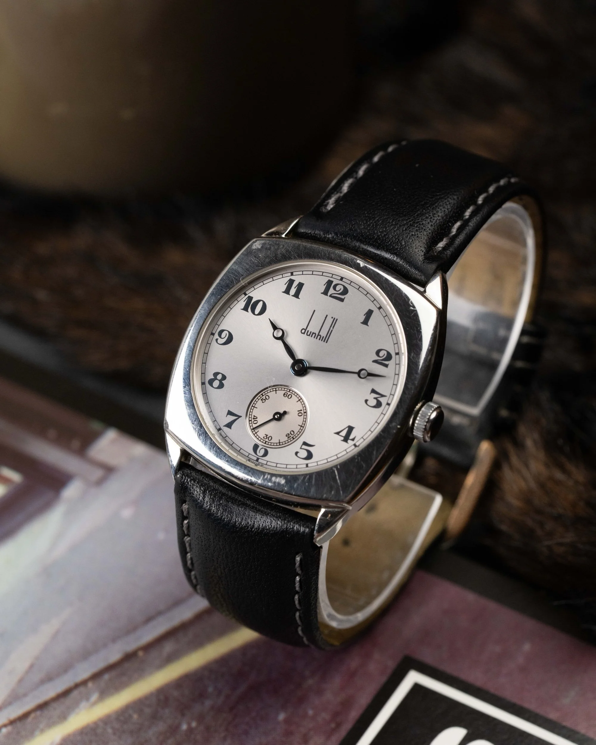 Created to mark Dunhill’s 100th anniversary, this rare timepiece blends early 20th-century charm with refined English design. The cushion-shaped stainless steel case measures a tasteful 32mm, echoing classic wristwatch proportions of the 1920s while offering timeless elegance for modern wear.