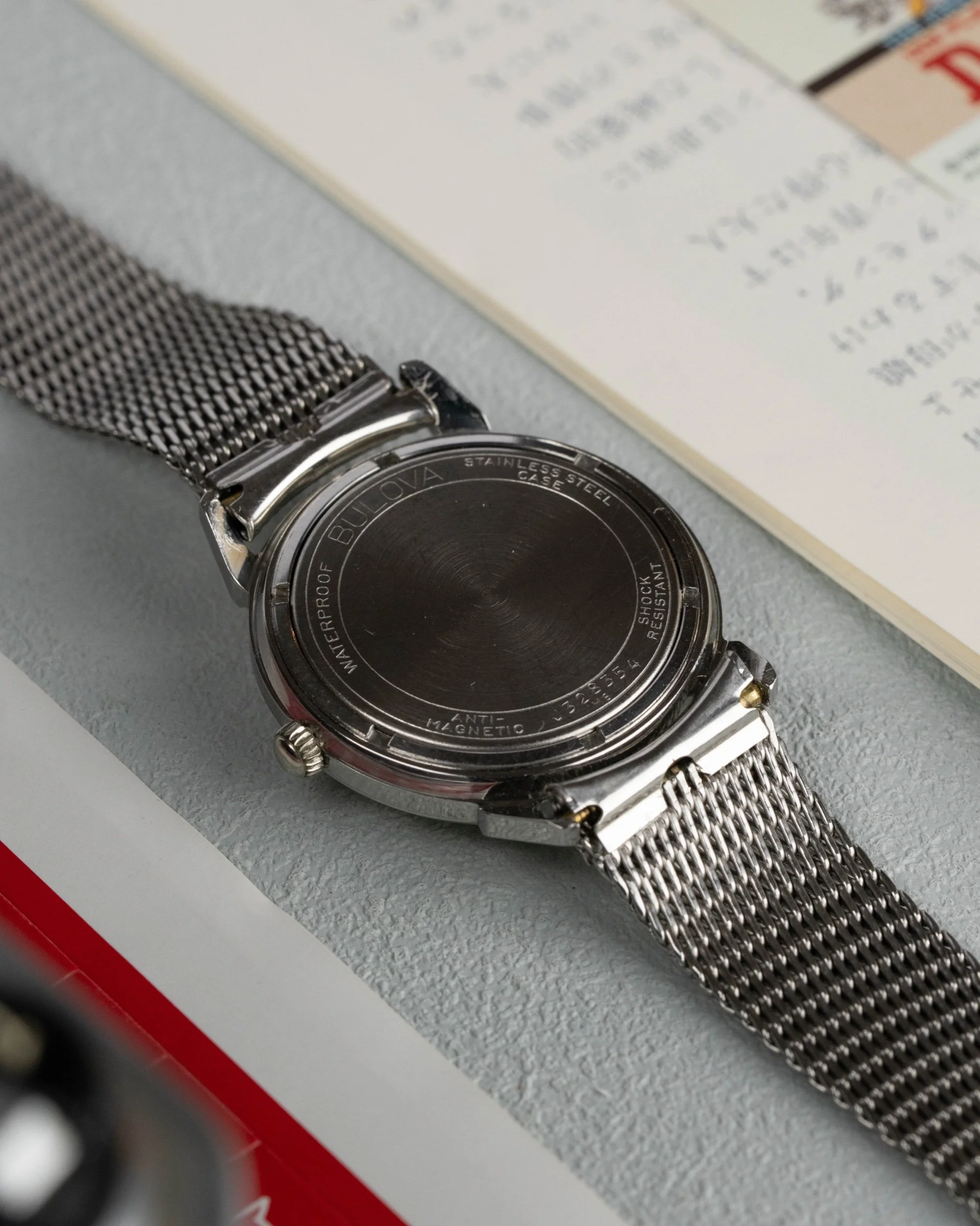 The stainless steel case is well-proportioned, with sharp lugs that give the watch presence without overwhelming the wrist. Paired here with a vintage-style mesh bracelet, it strikes the perfect balance of vintage sophistication and everyday wearability.