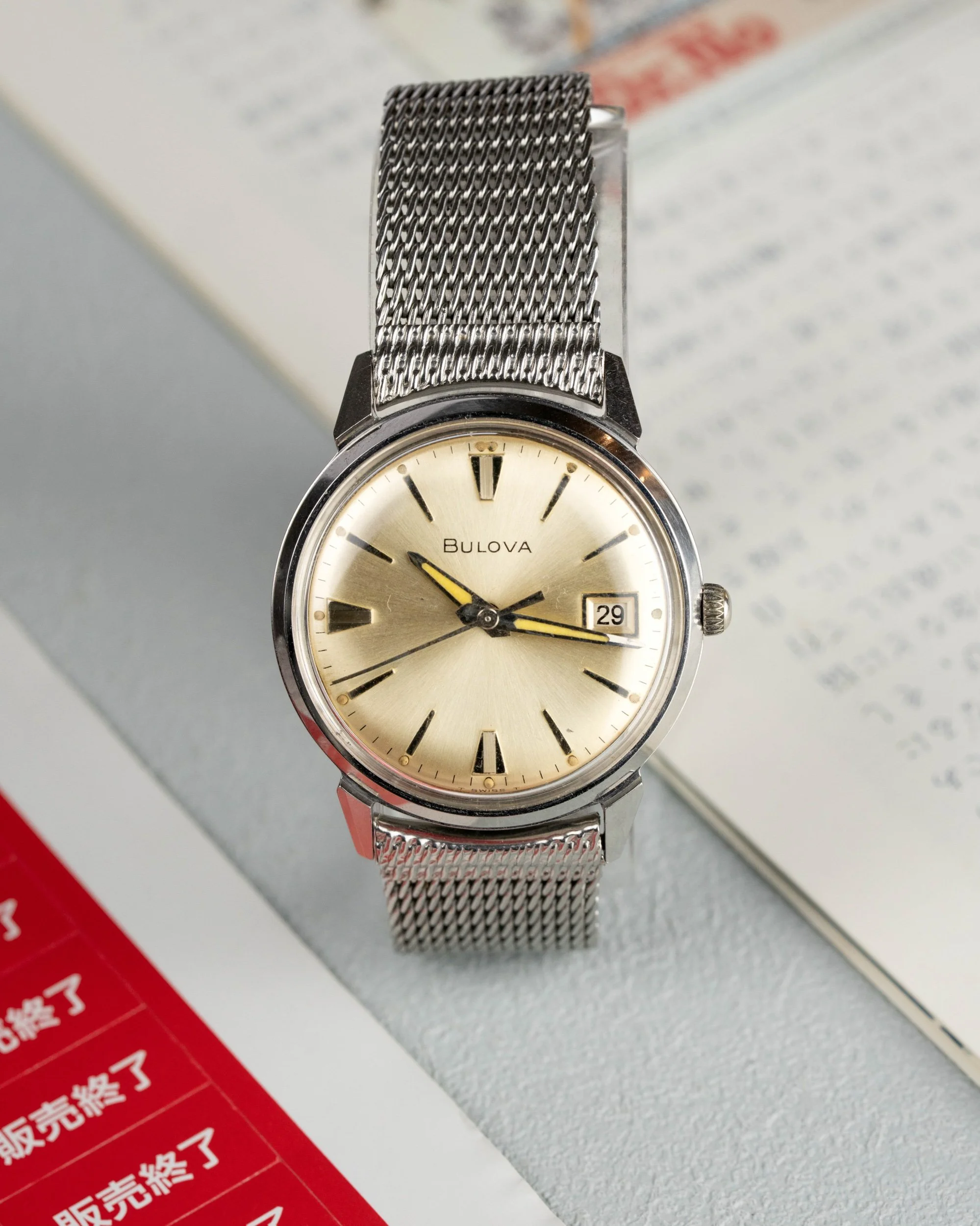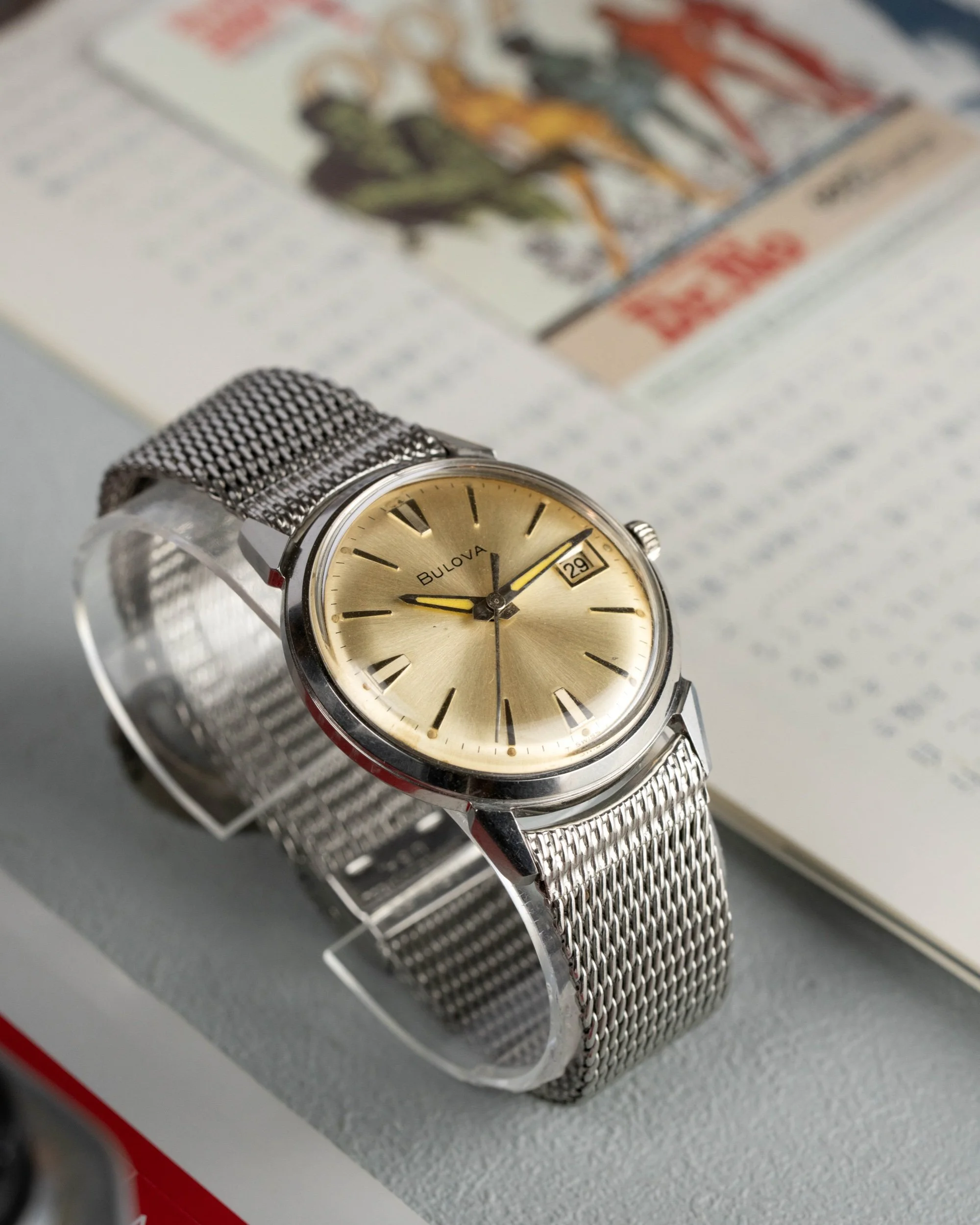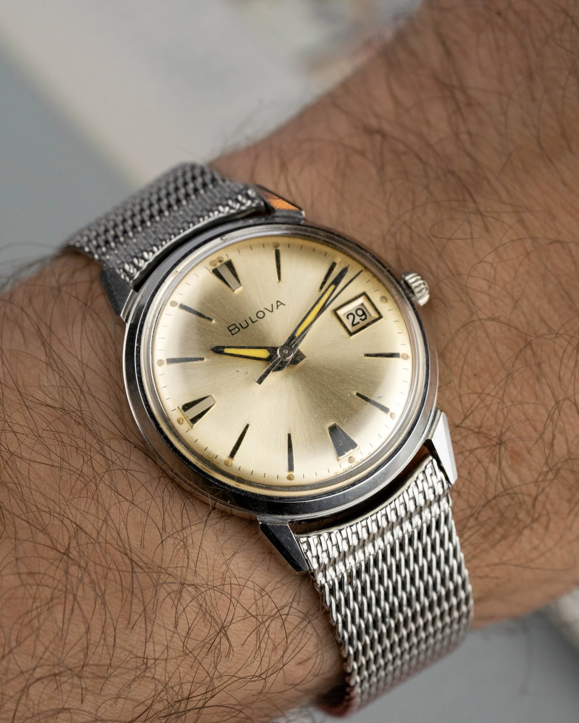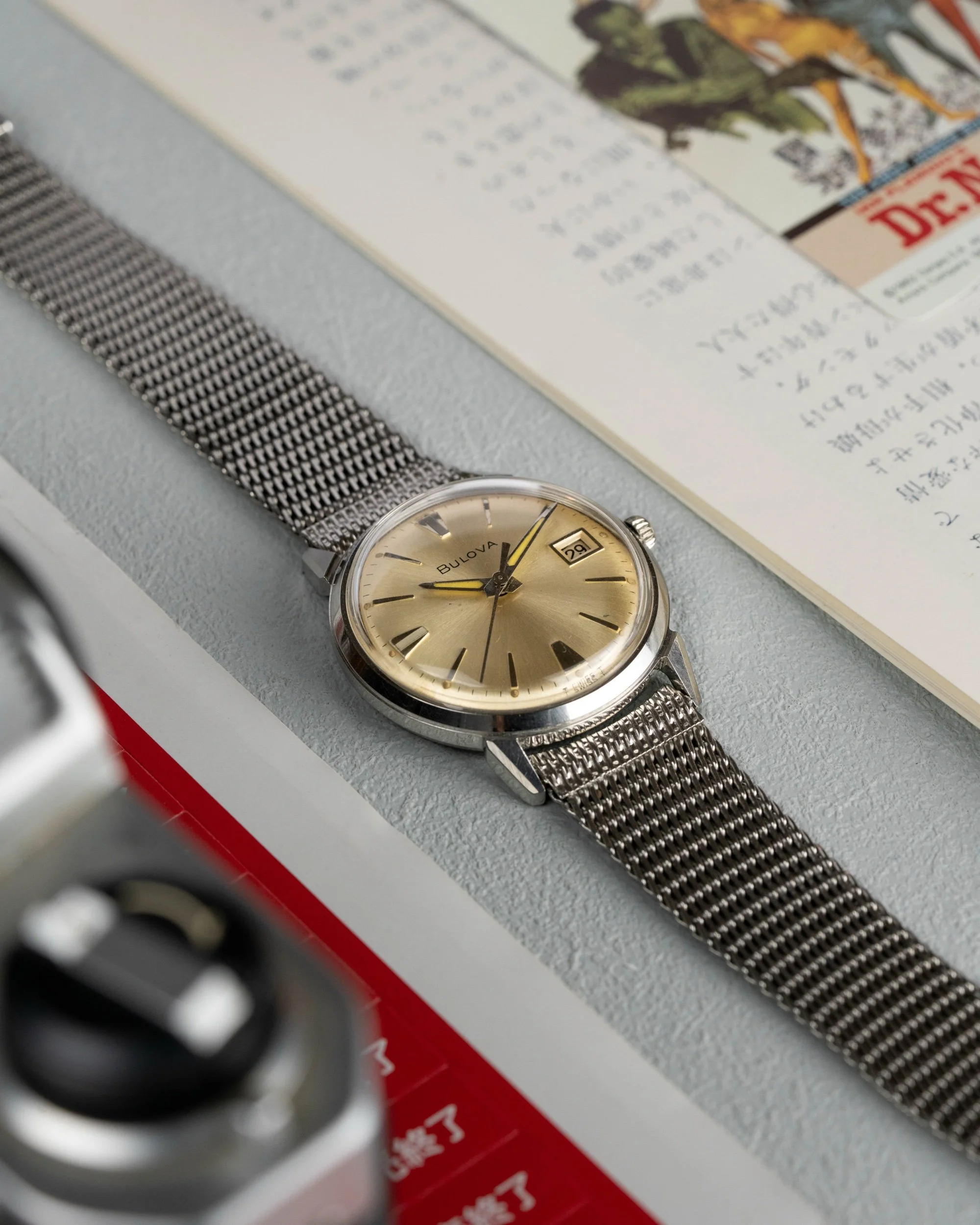 A refined and deco inspired dress watch from t1966, this Bulova Date King embodies the elegant simplicity that defined the era. With its sunburst champagne dial, applied indices, and date window at 3 o’clock, it offers timeless versatility, whether worn casually or as a classic companion for more formal occasions.